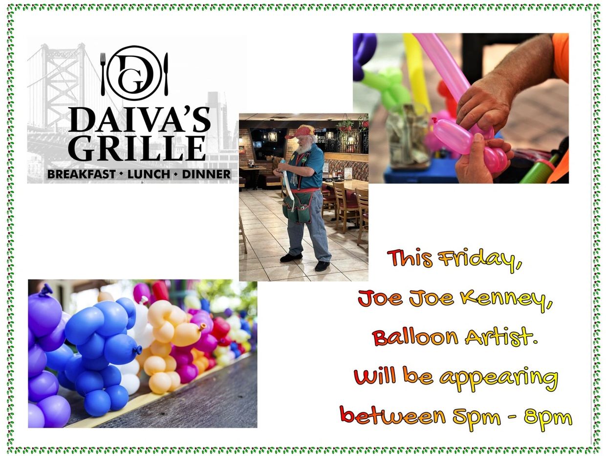 Joe Joe makes his appearances at Daiva's Grille on Fridays between the hours 5pm - 8pm. Joe Joe has been entertaining kids ages from to 1-100 since 1997. Skilled in balloon sculpting, magic, and quick with a joke. A few hours of fun and joy for everyone.